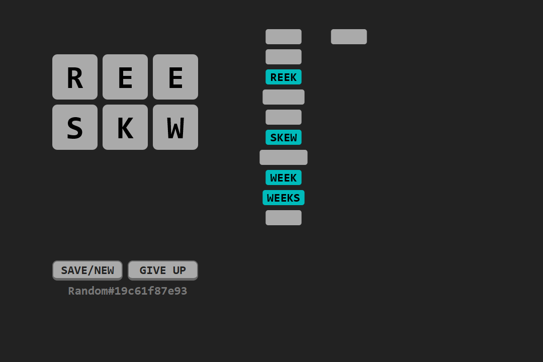 Common English words that can be found in the grid are shown to the right and will be revealed as you find them. Uncommon words can be found and added to the list; words are in alphabetical order, so this may provide a hint towards unrevealed words. Find all the common words to complete the level.