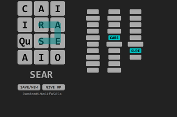 Click and drag to select letters forming a word. From each letter you can move to horizontally, vertically or diagonally to an adjacent latter. Each grid space can only be used once per word. The "Qu" space can be used as either "Q", "U" or "QU"; the game will automatically detect which forms a valid word.
